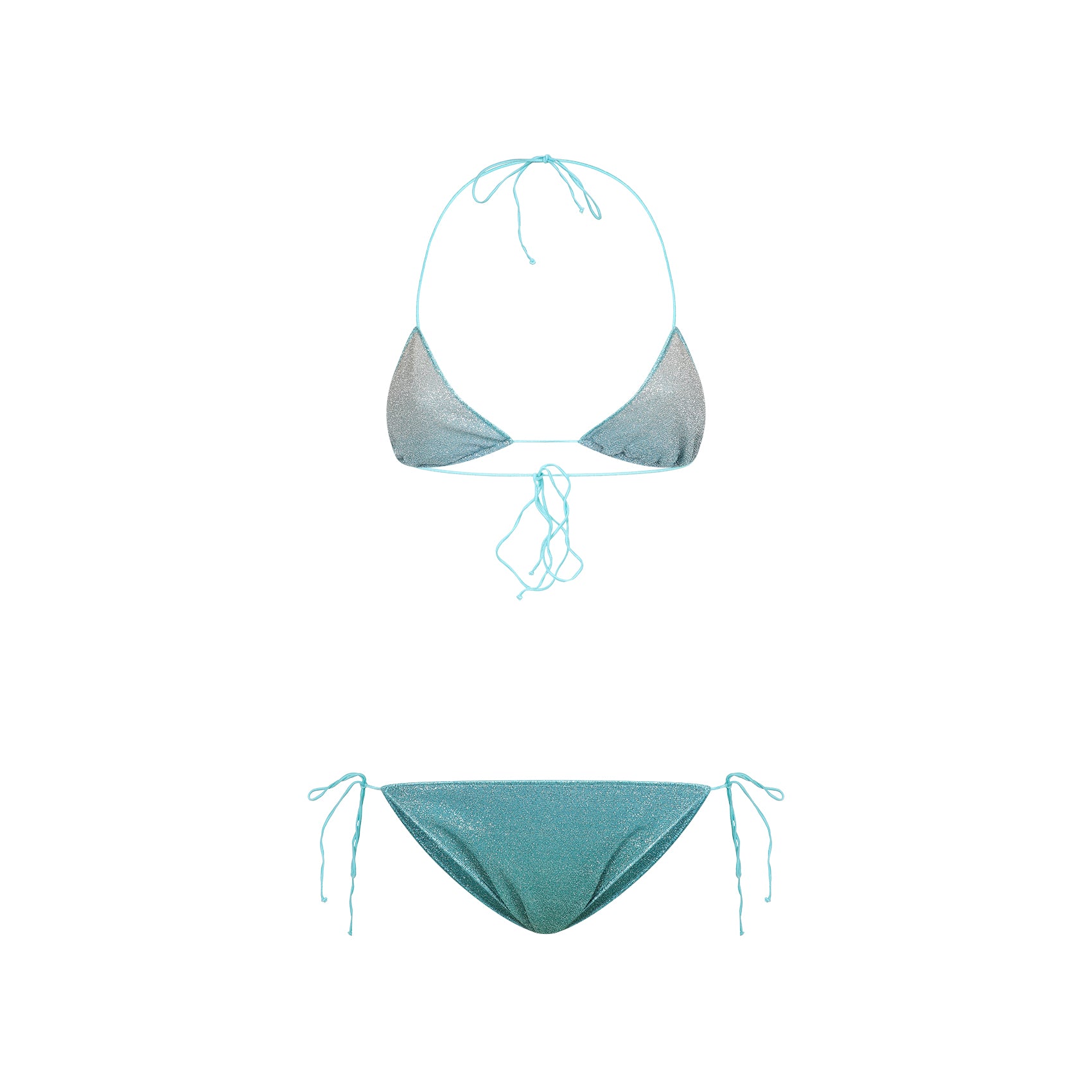 Oseree Swimwear Lumiere Shade Polyamide Bikini. Crafted from lurex green and turquoise tech fabric. Triangle top with self-ties fastening at the back, regular slip with self-tie fastening on the sides, fully lined.
