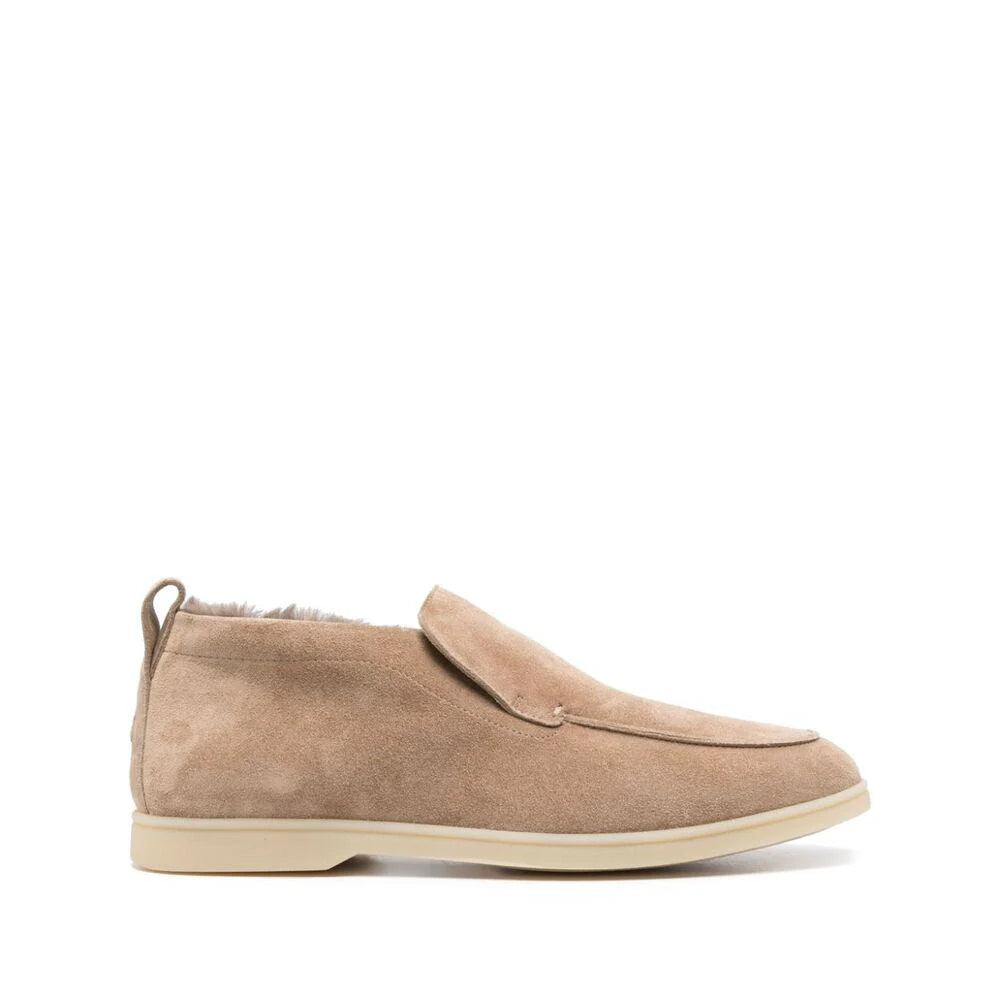 Sand beige calf suede pull-tab at the heel slip-on style round toe branded insole fleece lining flat rubber sole
