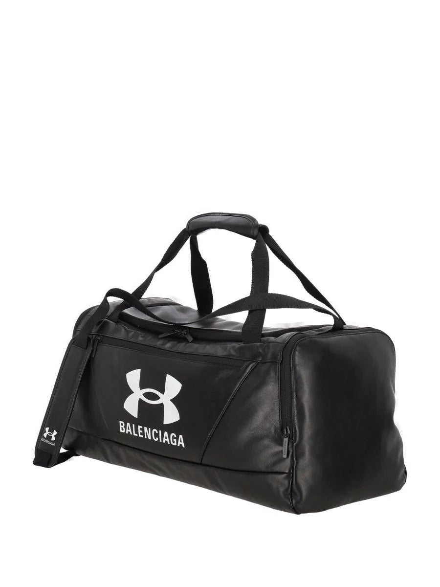 This black bag from Balenciaga is crafted from Under Armour material and features top handles, a zip closure, and a logo on the front.