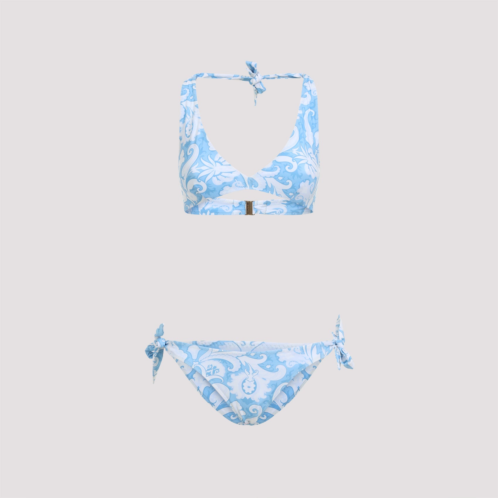 Etro Blue Polyamide Bikini. Light blue stretch tech fabric, signature print all over. Top triangle design, self-tie closure at the back collar, buckle fastening on the back. Regular fit slip, self-ties at the sides. Lined.
