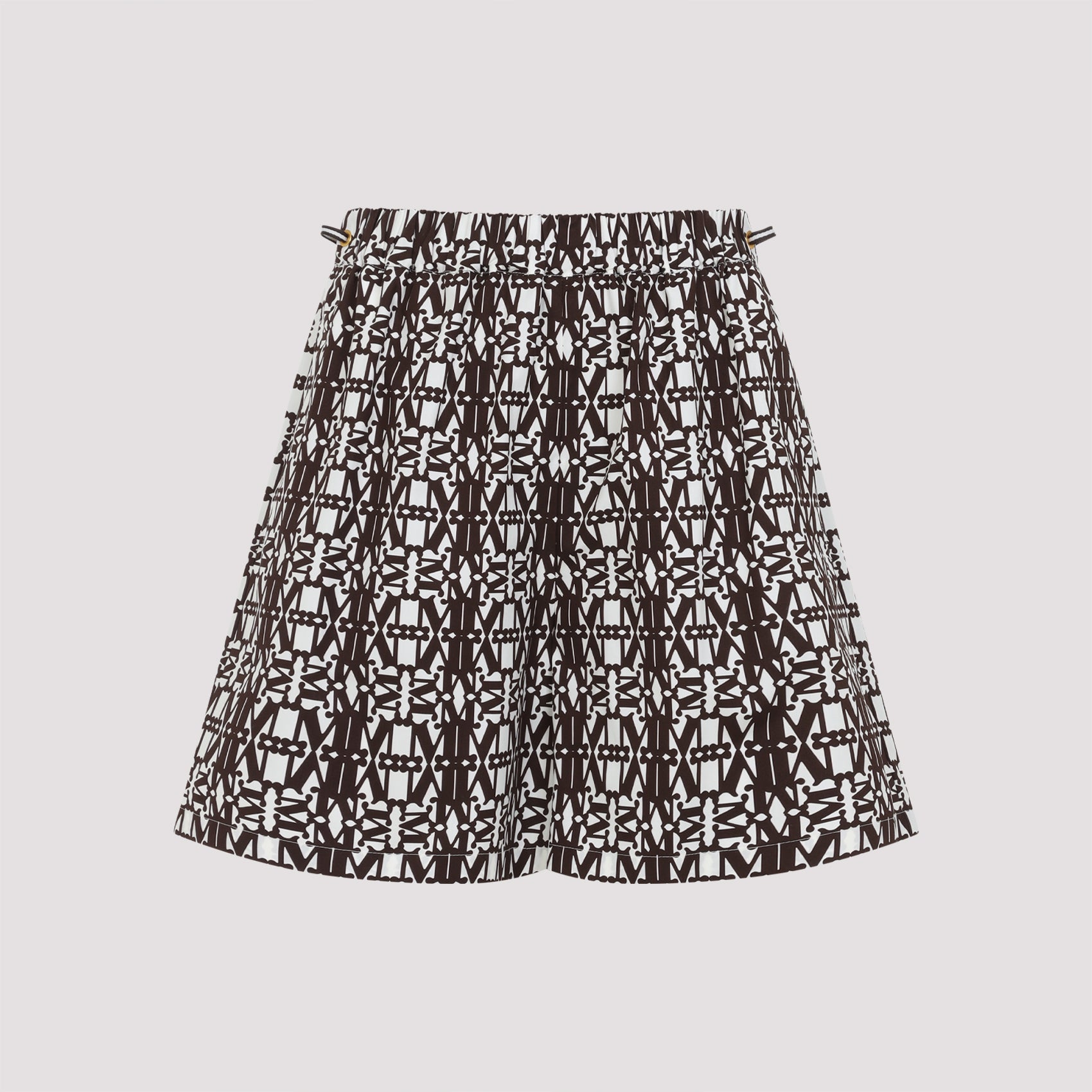 Max Mara Taiga Brown Cotton Shorts. Crafted from white and brown cotton poplin, monogram pattern all over, elastic waistband, golden-toned eyelets with drawstring at the side waist, side pockets, flared, straight hem.