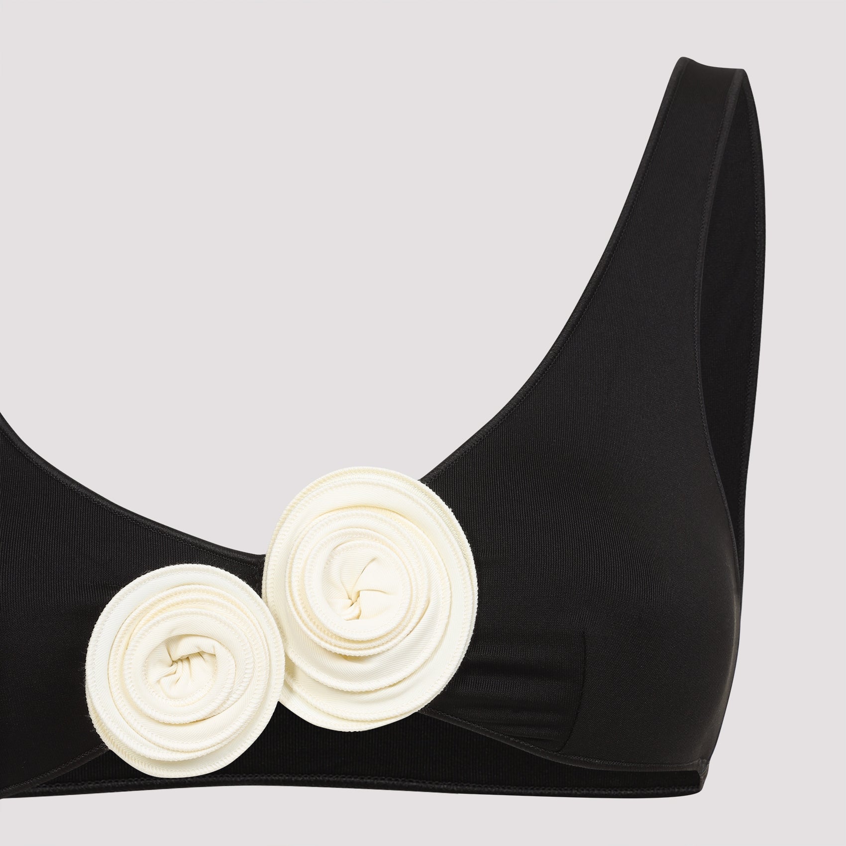 La Reveche Nuha Black Polyamide Bikini. Crafted from black tech fabric, bikini top with open round neckline, white contrasting floral detail on the front. V-cut slip, white floral detail on the side, fully lined.