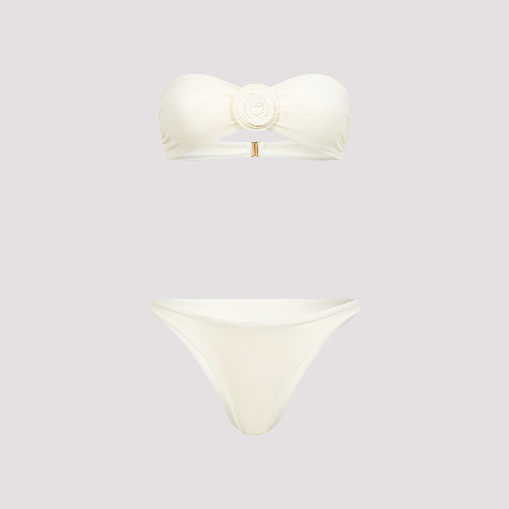 La Reveche Vesna Ivory Polyamide Bikini. Crafted fromivory tech fabric. Strapless bikini top, front flower detail, back buckle fastening. High-cut bikini slip, fully lined.