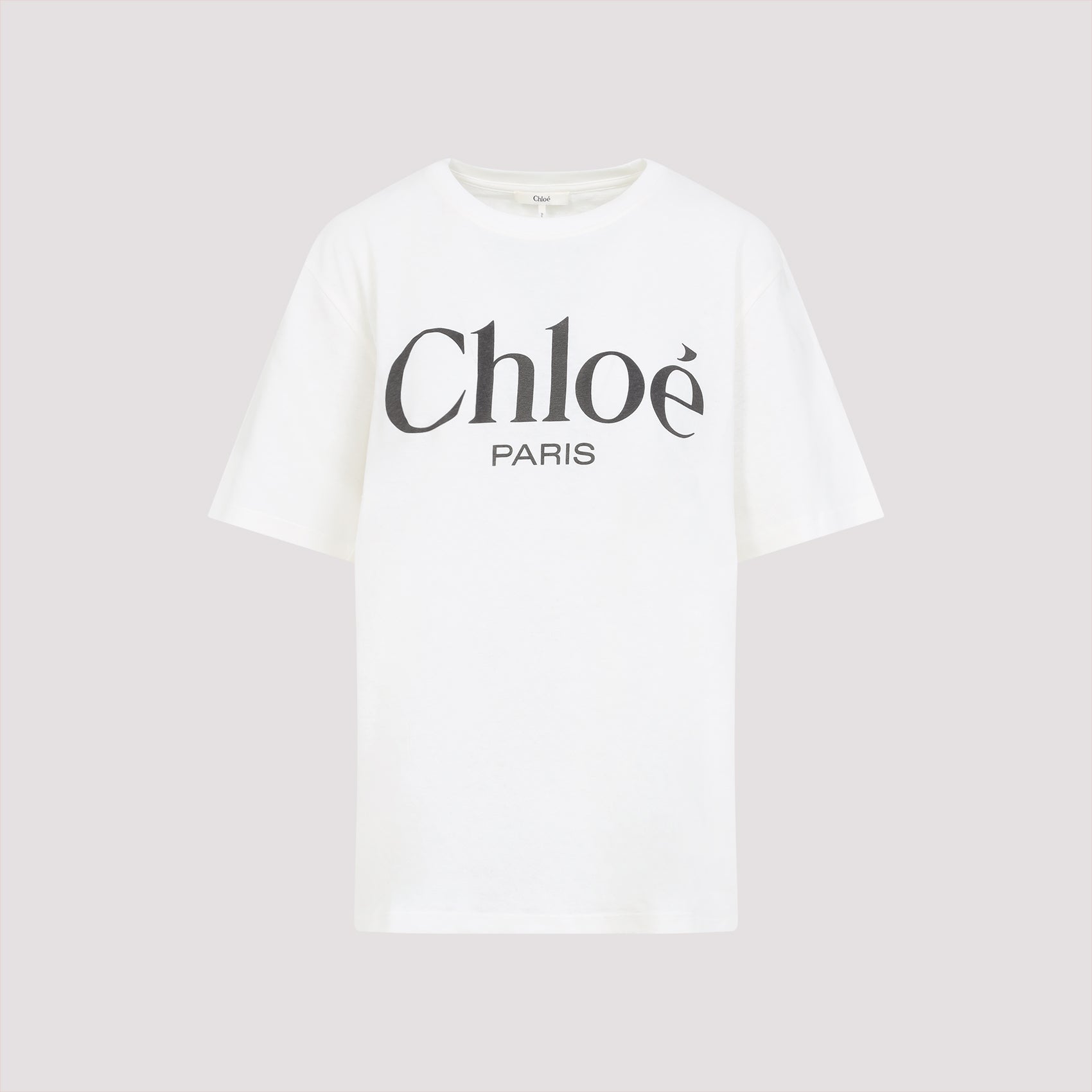 Chloe Logo White Cotton T-shirt. White cotton jersey, round ribbed neckline, dropped shoulders, short sleeves, logo stamped on the front, oversize fit, straight hem.
