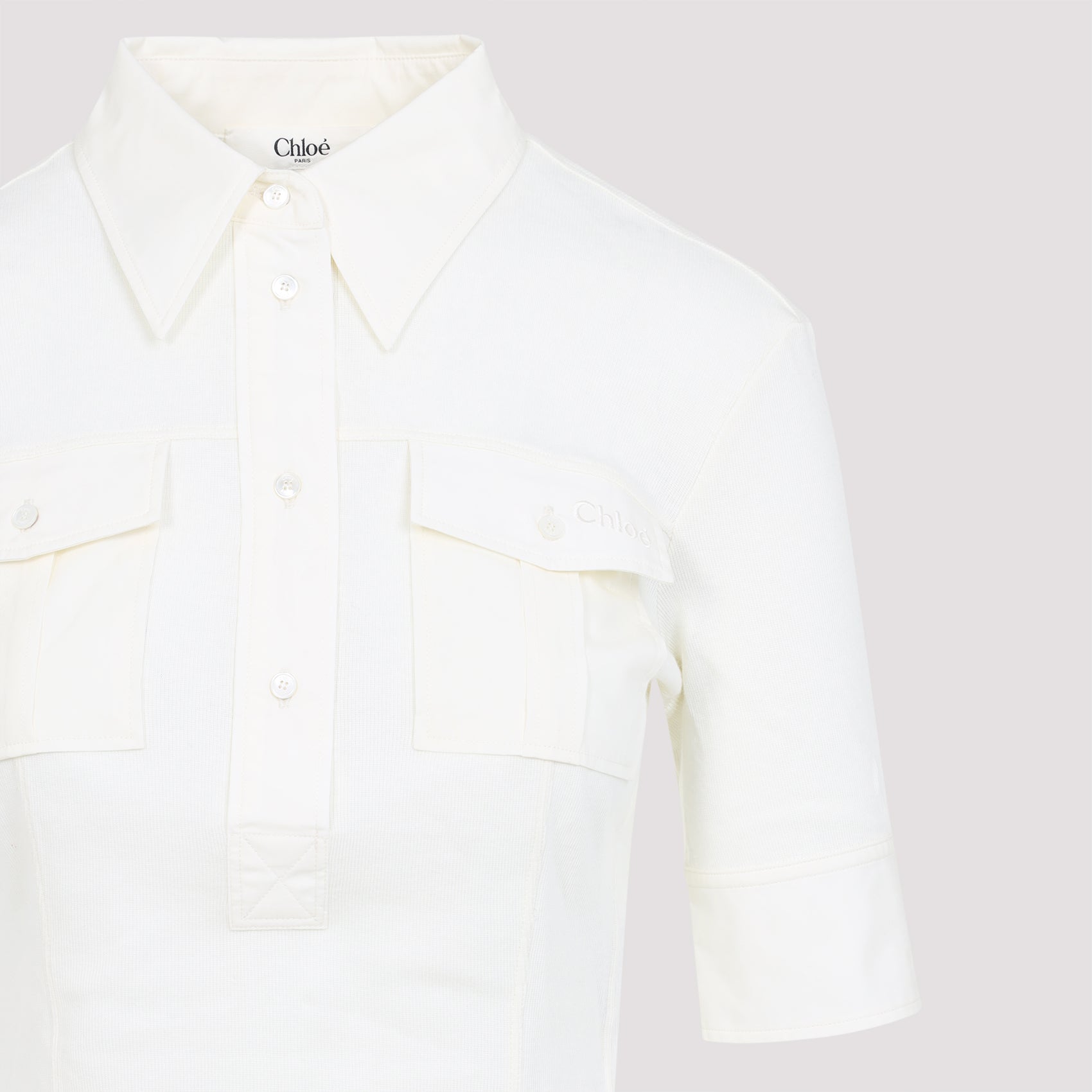 Chloe Coconut Milk White Cotton Polo. Pure coconut milk white cotton polo, pointed collar, front buttoned fastening, chest flap buttoned pockets, short sleeves, straight hem.