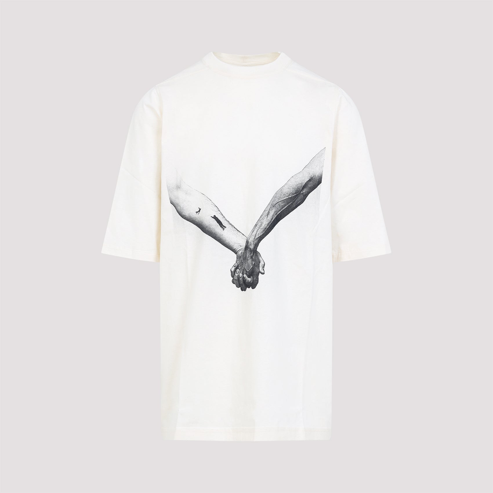 Rick Owens Natural White Cotton Jumbo Short Sleeves T-Shirt. Pure natural white cotton t-shirt, round neck, front black hands design, short sleeves, straight hem, tonal stitching.