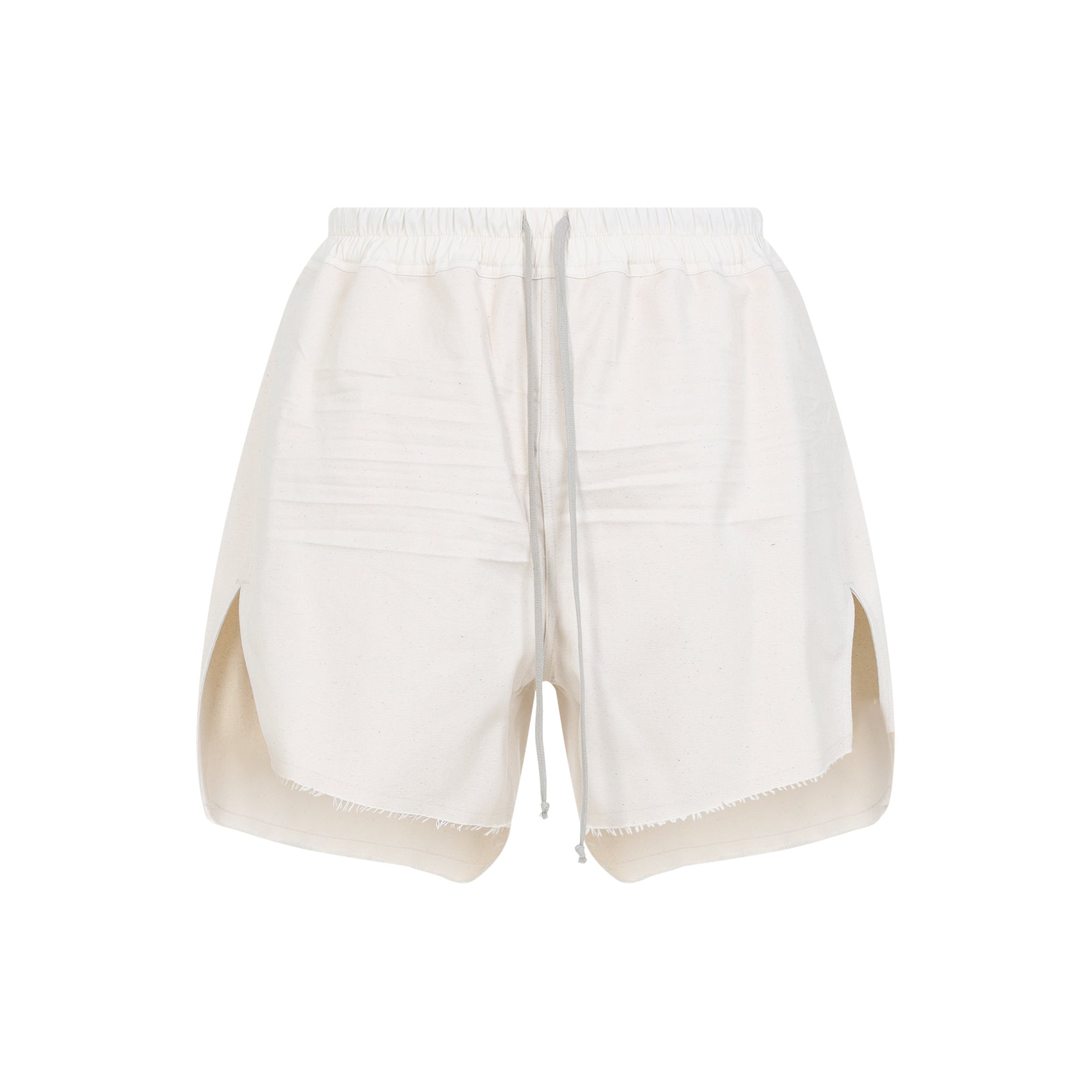 Rick Owens Natural White Cotton Boxers. Pure natural white cotton boxers, elastic waist, front grey drawstring details, side slit details, fringed asymmetric hem.