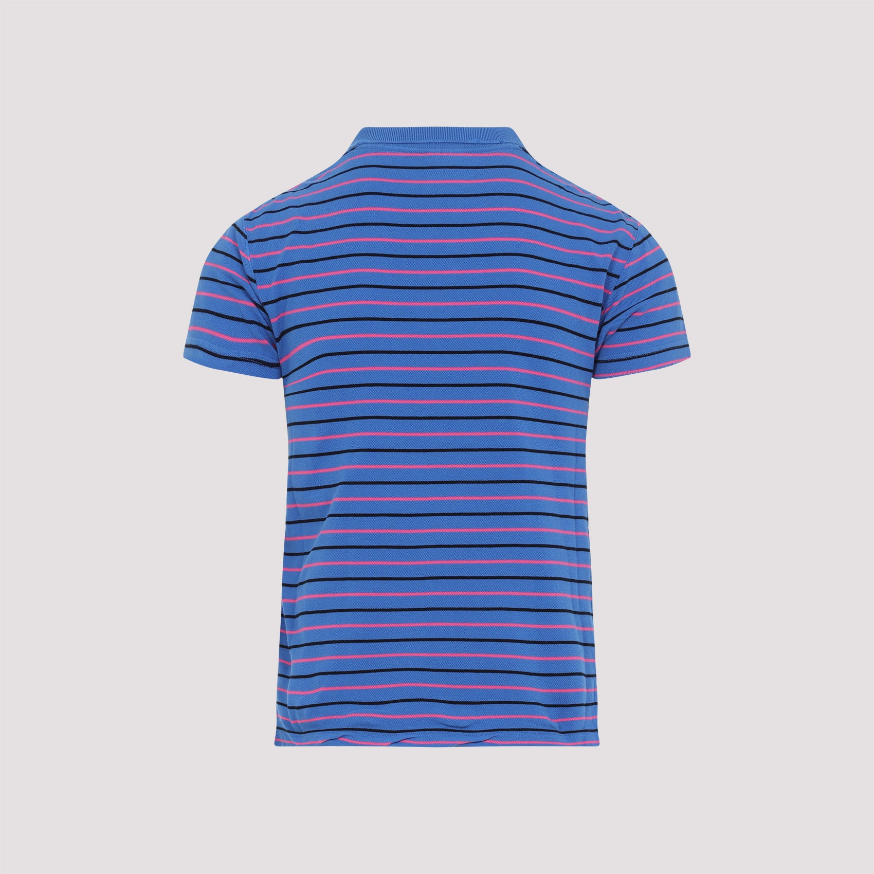 Balenciaga SS Fitted Light Blue Cotton Polo. Crafted from light blue cotton pique, slightly used effect, black and pink striped pattern, polo collar, front two-button fastening, Laurel Logo embroidered on the chest, short sleeves, straight hem.
