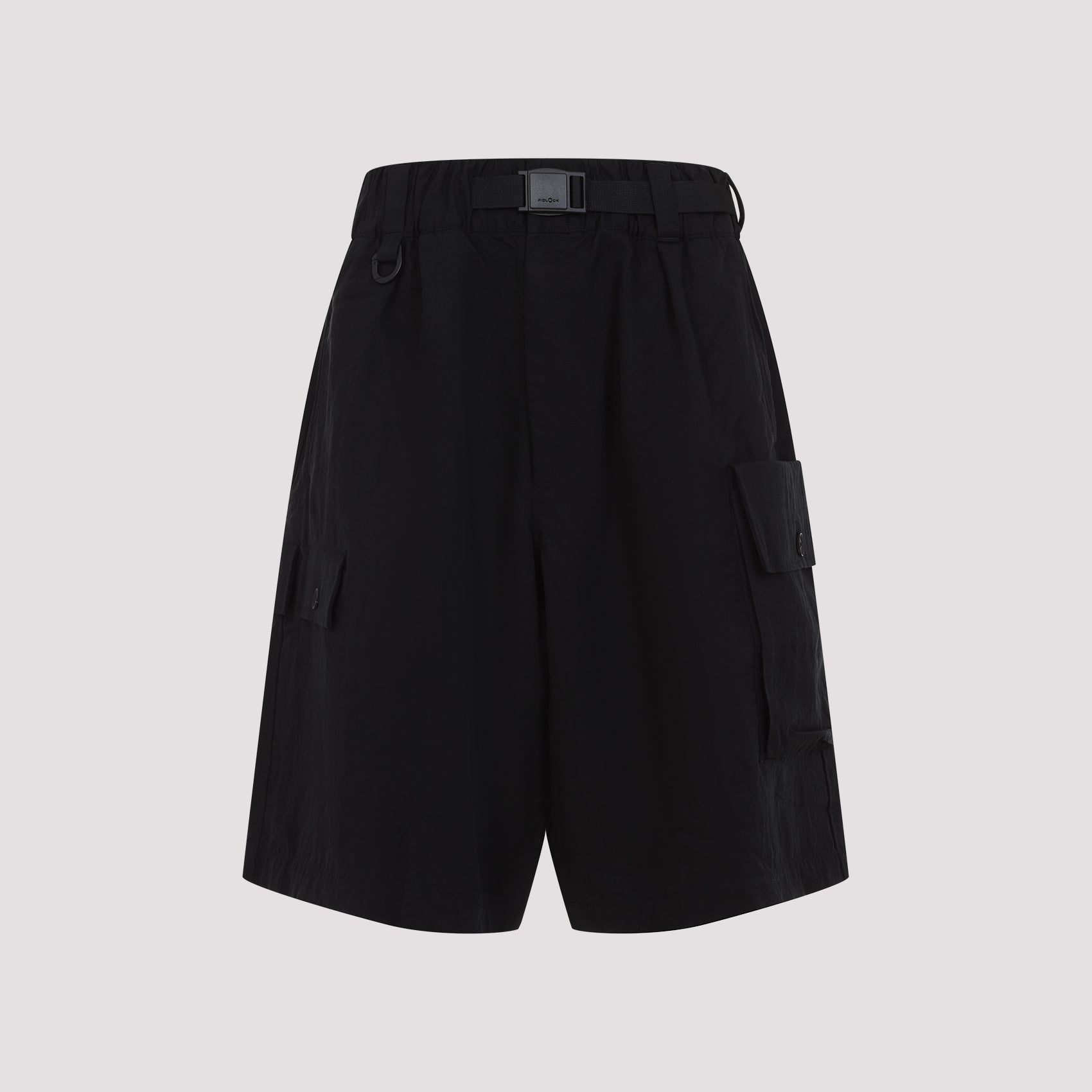 Y 3 Black Lyocell Twill Shorts. Crafted in lyocell and polyamide blend. Front concealing zipped and hooked fastening, elastic waist, tonal belt, belt loops, side pockets, back slit pockets, side flap buttoned pockets, straight hem, tonal stitching.