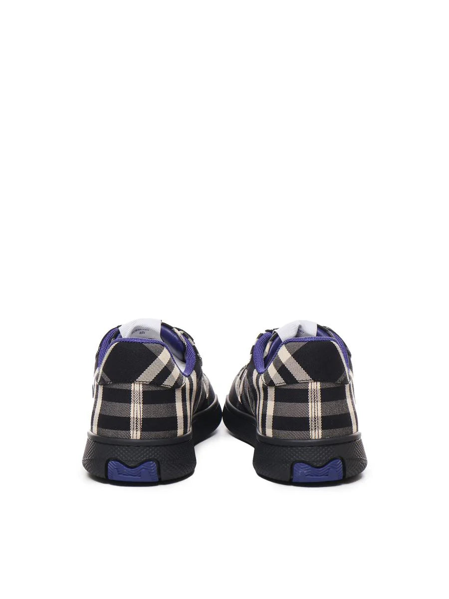 Sneakers crafted from a blend of polyester, cotton, and rubber featuring a distinctive 'Check' pattern. They include a central tongue and a logo in a contrasting design. The laces also showcase the 'Check' motif, while the toe has a ton sur ton finish. The rubber sole is embossed with logo lettering. Made in Italy.