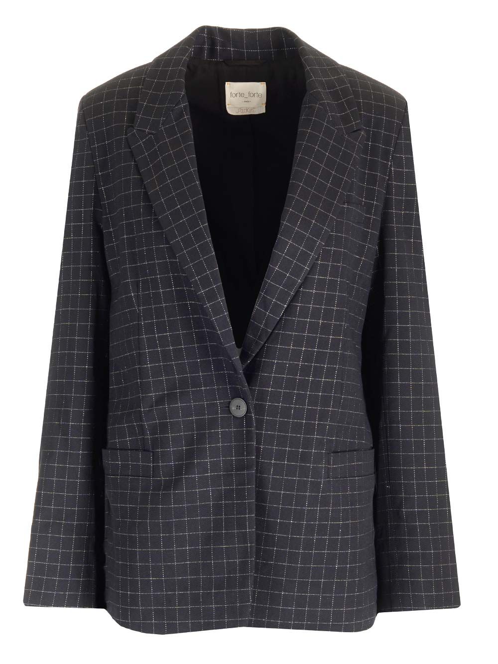 Boxy fit blazer in bright black batavia with lightly padded shoulders and a boxy fit, straight waist, and a lurex windowpane motif from Forte Forte.