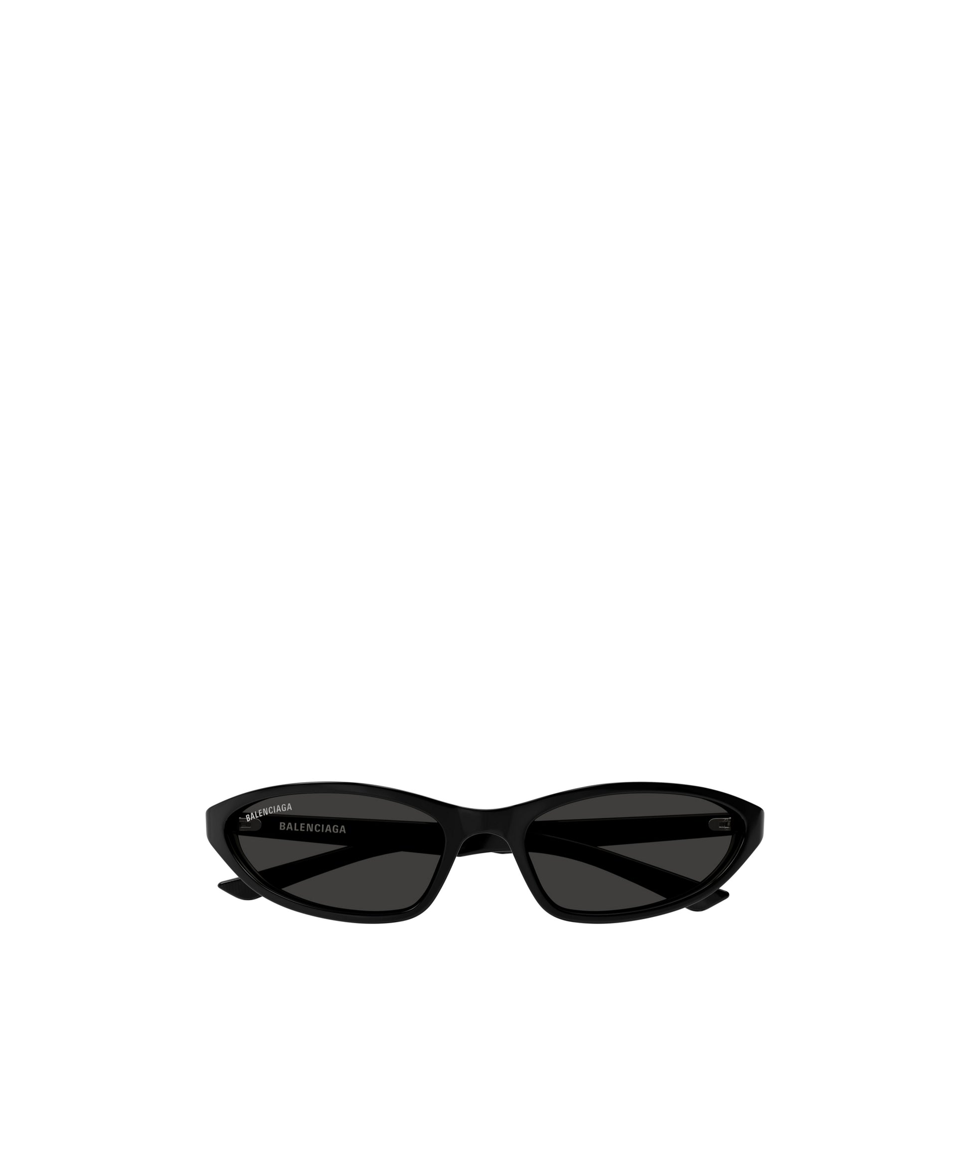 Balenciaga BB0402S-001 - BLACK (BB0402S-001) are elegant oval sunglasses with a slight cat-eye silhouette. They feature black recycled acetate frame, white Balenciaga logo on temples, and grey lens with 100% UV protection.