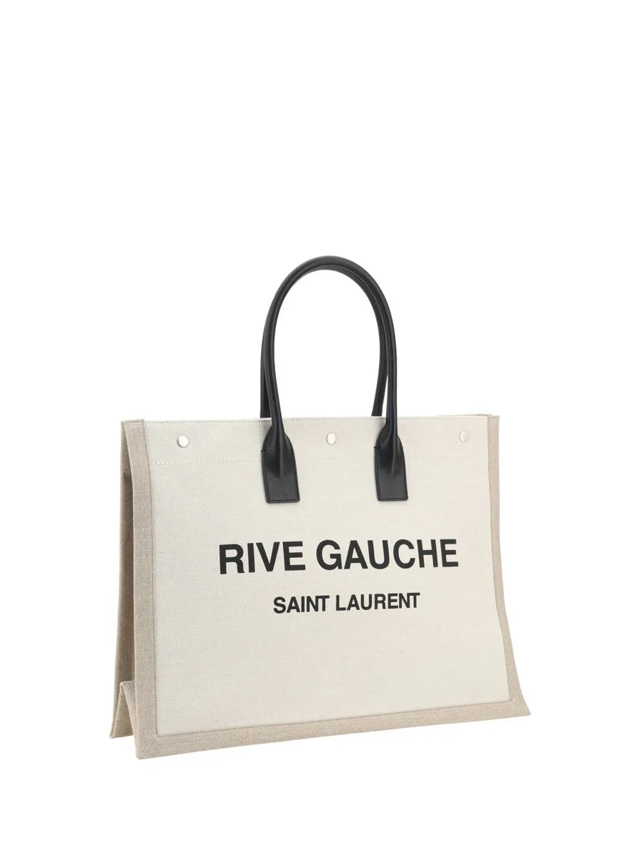 THE SAINT LAURENT COTTON RIVE GAUCHE HANDBAG IS A PERFECT EXAMPLE OF CASUAL CHIC. WITH ITS UNDERSTATED AND SOPHISTICATED DESIGN, THE BAG FEATURES A CONTRASTING DOUBLE LEATHER TOP HANDLE THAT ADDS A TOUCH OF LUXURY TO THE OVERALL LOOK. THE FRONT OF THE BAG IS EMBELLISHED WITH THE ICONIC SAINT LAURENT MONOGRAM AND "RIVE GAUCHE" GRAPHICS, WHICH DEFINE ITS DISTINCTIVE AESTHETIC. THE TOP SNAP-BUTTON CLOSURE PROVIDES SECURITY AND CONVENIENCE, WHILE INSIDE A ZIPPERED WELT POCKET OFFERS ADDITIONAL SPACE TO ORGANIZE YOUR BELONGINGS. THIS BAG IS IDEAL FOR THOSE LOOKING FOR A VERSATILE ACCESSORY THAT FITS PERFECTLY WITH BOTH CASUAL AND MORE ELEGANT LOOKS, WHILE ALWAYS MAINTAINING A TOUCH OF SOPHISTICATION.