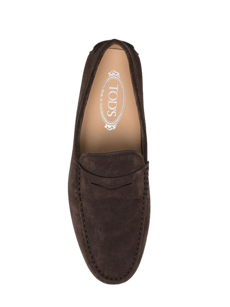 Chocolate brown suede with an embroidered logo, featuring a penny slot design and signature Gommino sole. The almond toe adds a stylish touch. Heel height is 2.5 centimeters, with a sole height of 2.0 centimeters.