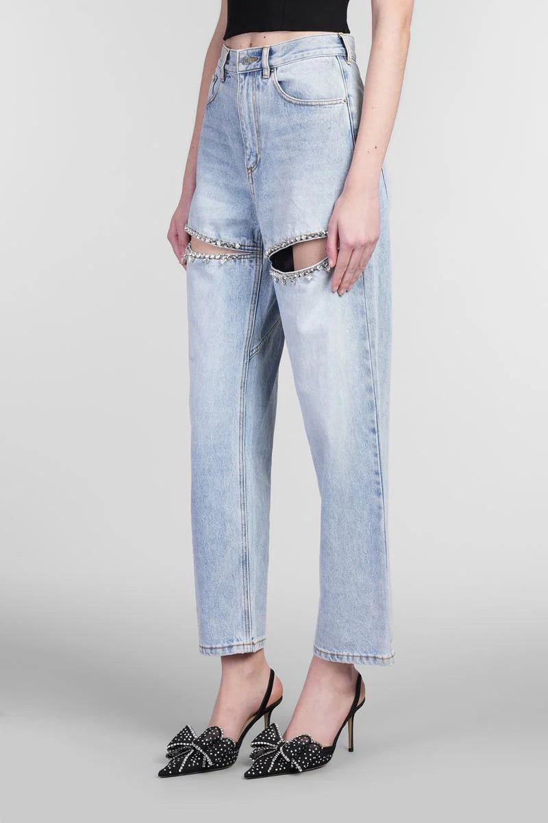 Jeans in blue denim, frontal closure with zip and buttons, waist belt loops, five pockets, stitching detail, cowboy embroidered, cut off details, multicolor strass details