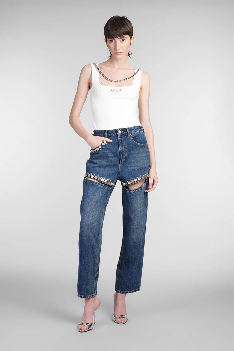 Jeans in blue denim, zip and button closure, waist belt loops, five pockets, pocket on backside, cowboy embroidered, cut off details, buttons detail