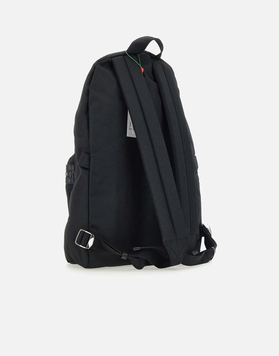 The men's 'Kenzography' backpack from Kenzo Paris features a sleek black design crafted from technical polyester. It includes a leather patch on the front zipped pocket showcasing a printed and embossed logo. The backpack has a spacious single compartment secured with a two-way silver metal zip, a top handle, and adjustable padded straps for comfort. Inside, there is an additional pocket for organization. A dustbag is included for protection. Dimensions are 46 cm in height, 28 cm in base length, and 10.5 cm in depth.