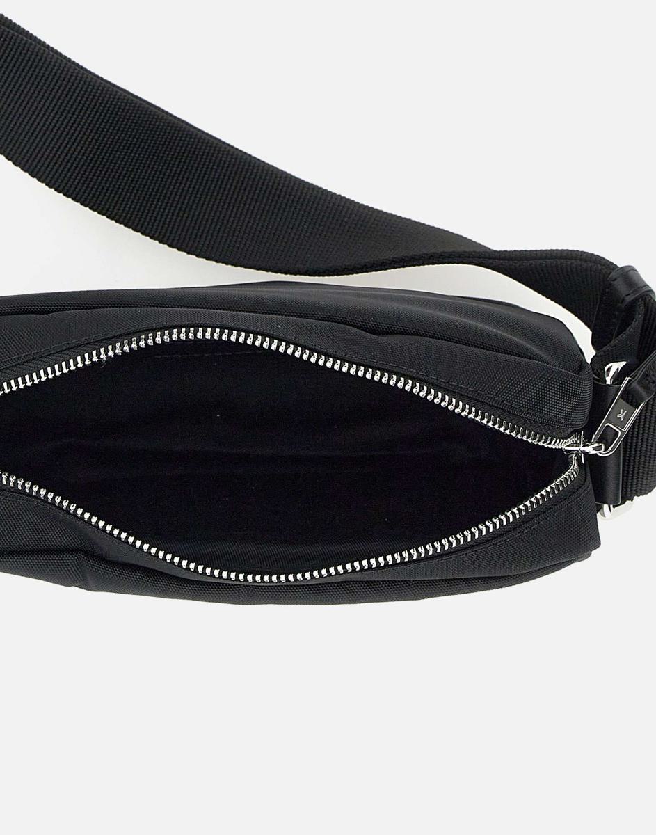 This men's shoulder bag in black features a fabric construction with a zip closure and an interior flat pocket. It showcases shiny silver electroplating, embroidered logos, and contrasting colors on the exterior. The adjustable shoulder strap measures approximately 100 cm. The bag's dimensions are 22 cm in length, 13.5 cm in height, and 7 cm in depth. A dustbag is included for protection.