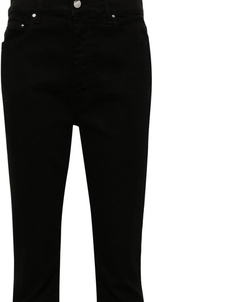 Classic black denim featuring belt loops, five-pocket design, and a logo patch on the back. The flared front includes a button and zip closure.