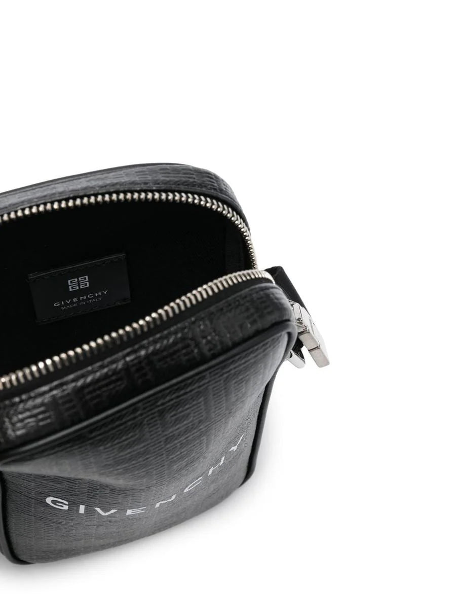 This bag features a jet black cotton exterior adorned with the signature 4G motif logo printed on the front. It includes an all-around zip closure and an adjustable shoulder strap for convenience. The dimensions are as follows: depth of 4.0 centimeters, height of 17.5 centimeters, strap length of 52.0 centimeters, and width of 11.0 centimeters.