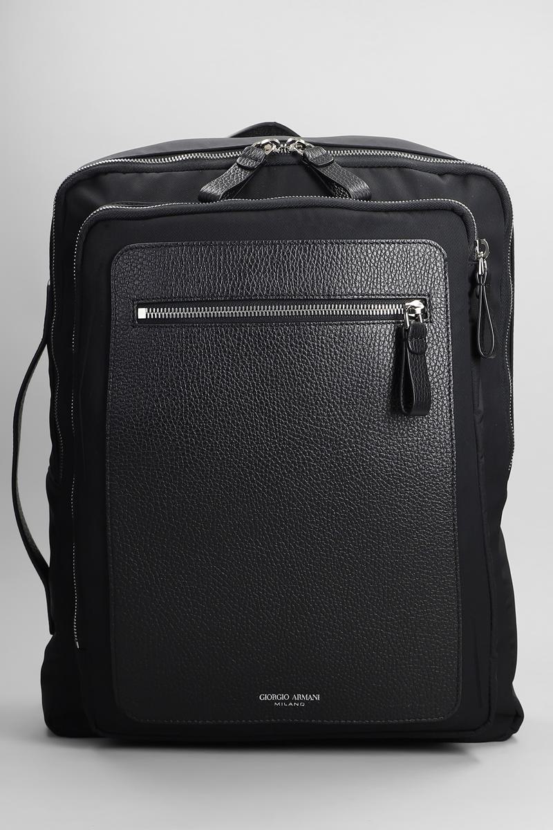 Backpack in black polyester, Height 400 mm, Width 320 mm, leather handle, adjustable shoulder strap, double zip closure, frontal zip pocket, engraved logo, double zip with leather sliders, silver hardware, 100% polyester, Made in Italy