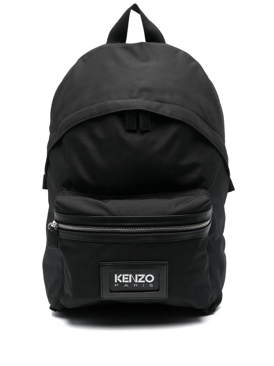 This black canvas bag features a logo patch on the front and an internal logo patch. It includes a two-way zip closure, a single flat top handle, and two padded adjustable shoulder straps. The front compartment zips closed for added security, while the main compartment has an internal pocket for a laptop, all lined with cotton. The bag comes with a protective dust bag.