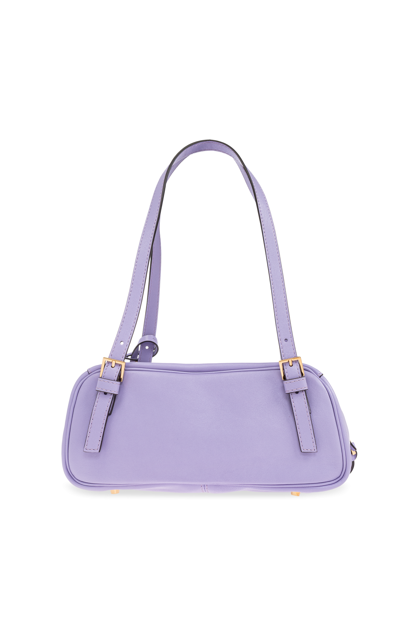 adjustable shoulder strap, fastened with gold buckles, allows for