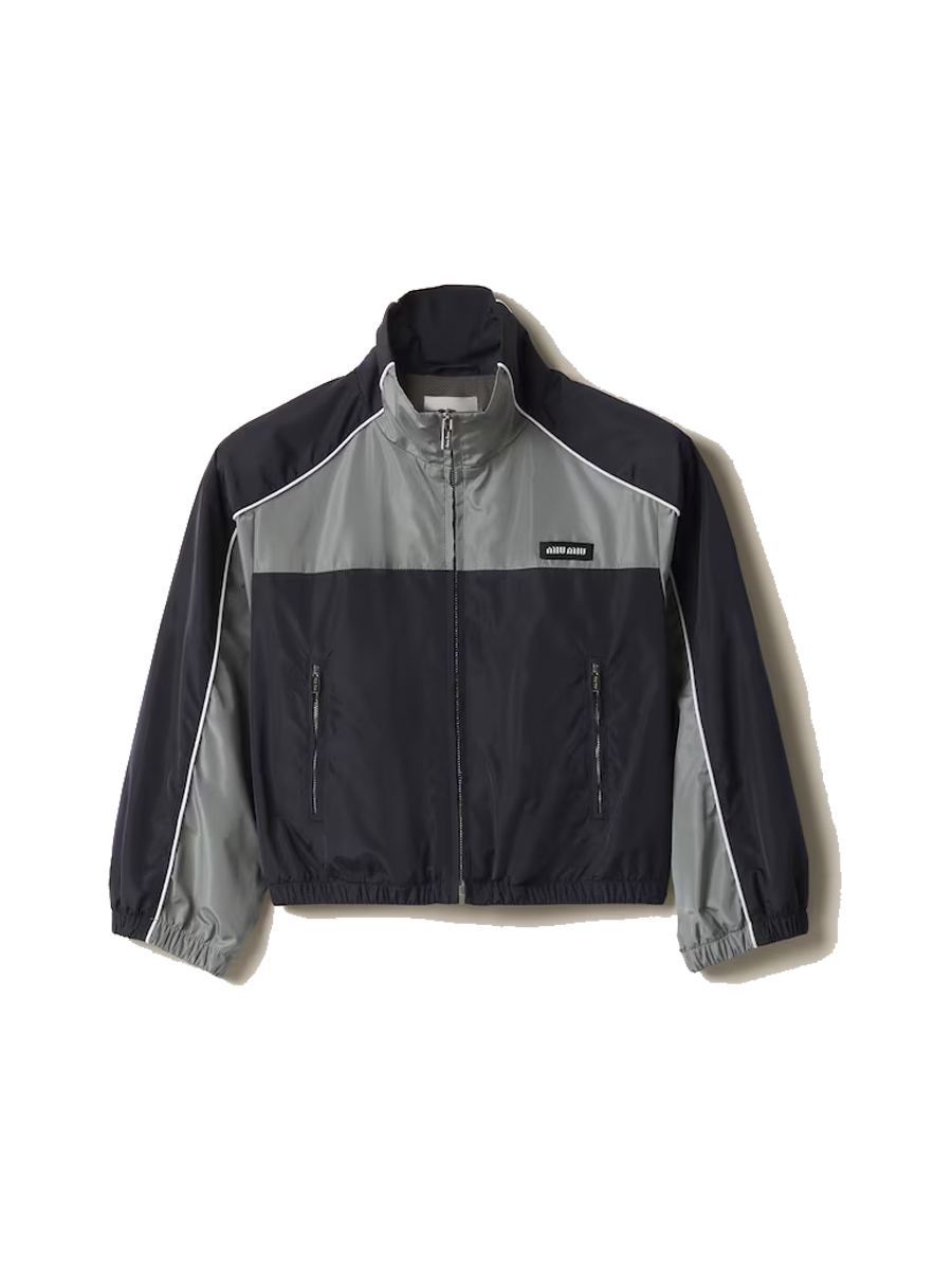 Technical silk fabric with a sporty, casual attitude enhances the lines of this zipper blouson jacket with a cropped fit to wear with classic garments, defining the iconic essence of the Miu Miu uniform.