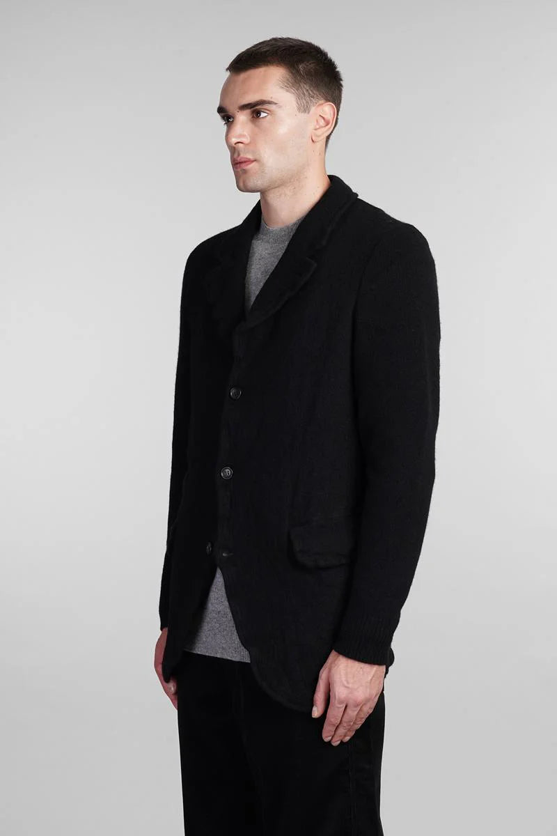 Casual jacket in black wool, revers, long sleeves, three buttons closure, flap pockets, wavy hem detail, distressed strap, 90% virgin wool, 10% polyamide, fully lined, 100% cupro, Made in Japan