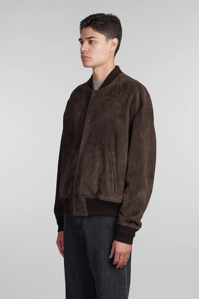 Bomber in brown leather, bomber collar, long sleeves, side pockets, ribbed cuffs and bottom, metallic logo, 100% leather, fully lined, 100% cotton, Made in Italy