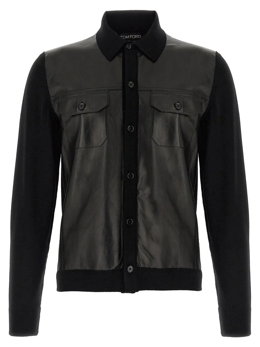 Two-material knitted wool overshirt with leather front vest, button closure, pockets, long cuffed sleeves
